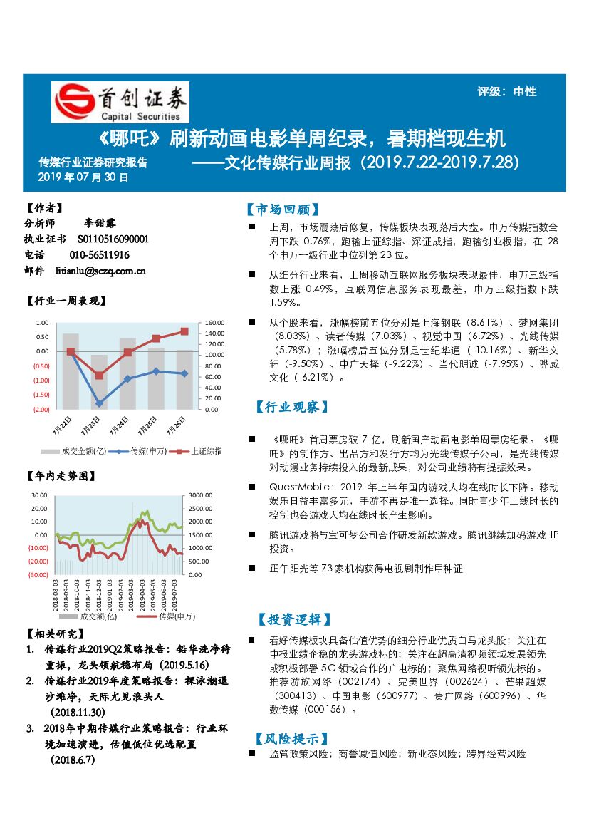 首创证券:文化传媒行业周报:《 哪吒》刷新动画电影单周纪录,暑期档现生机.pdf