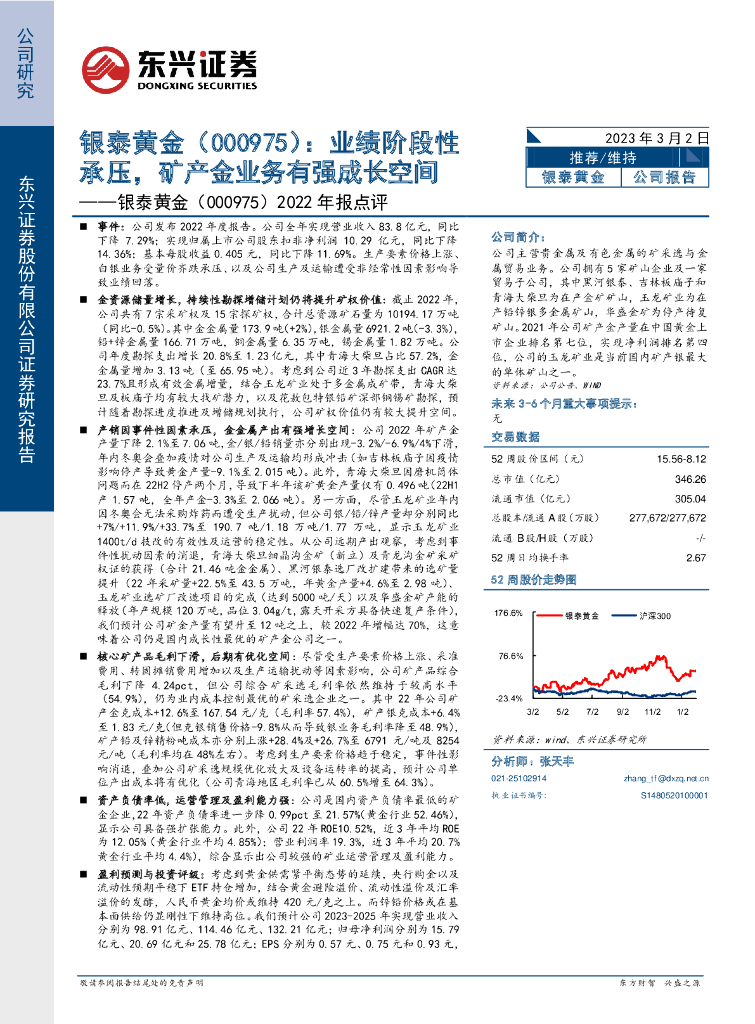 东兴证券:银泰黄金(000975)-2022年报点评:业绩阶段性承压,矿产金业务有强成长空间.pdf