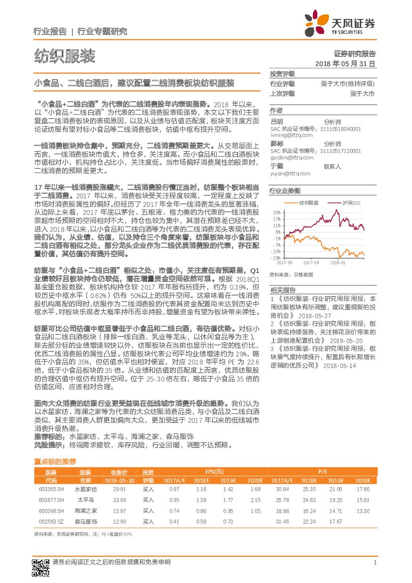 天风证券:纺织服装行业报告:小食品、二线白酒后,建议配置二线消费板块纺织服装.pdf