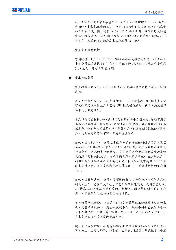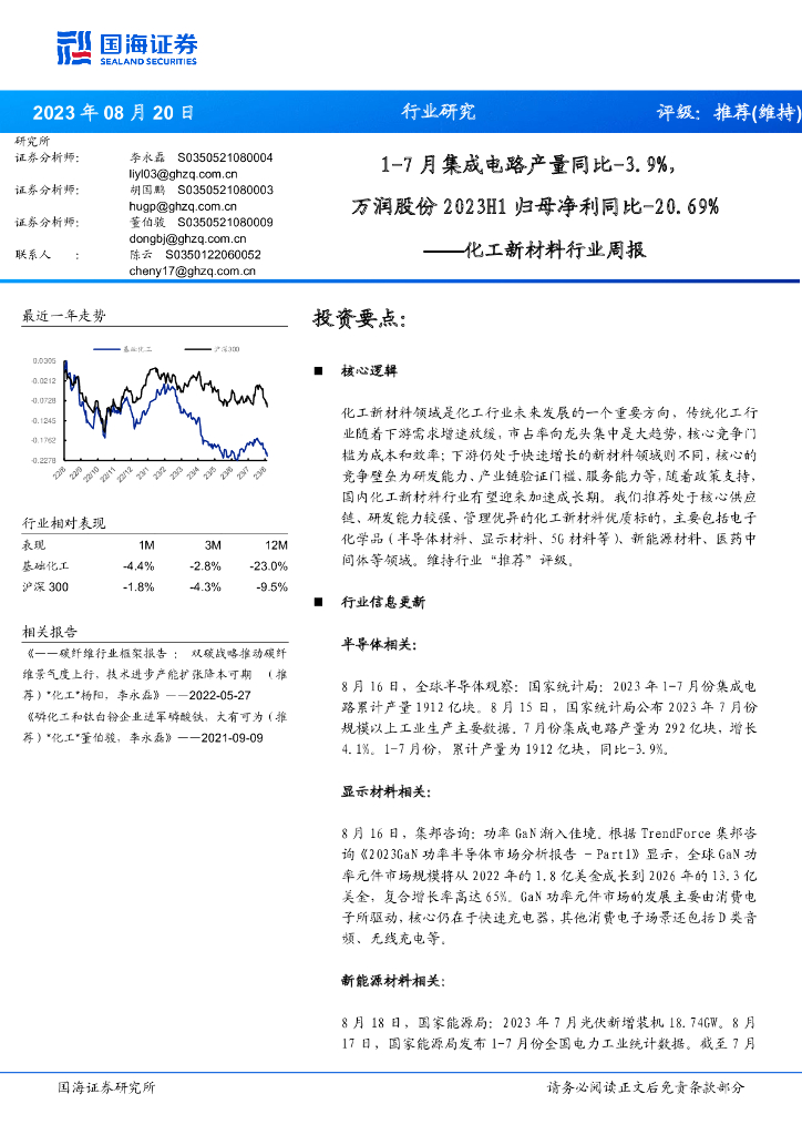 国海证券:化工新材料行业周报:1-7月集成电路产量同比-3.9%,万润股份2023H1归母净利同比-20.69%.pdf