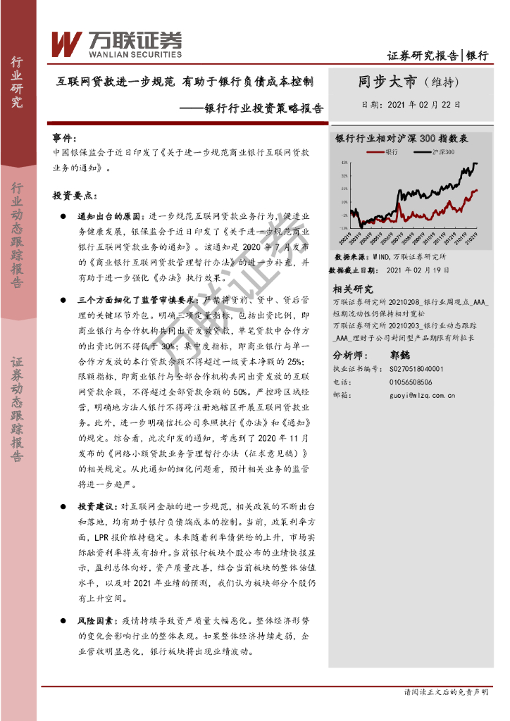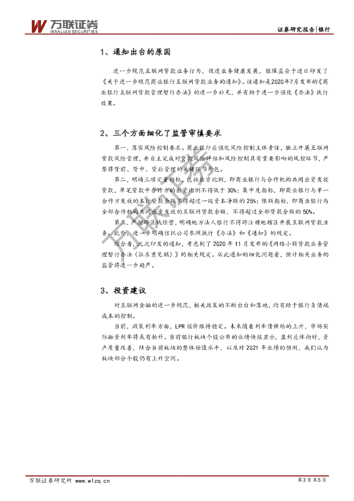万联证券:银行行业投资策略报告:互联网贷款进一步规范 有助于银行负债成本控制.pdf