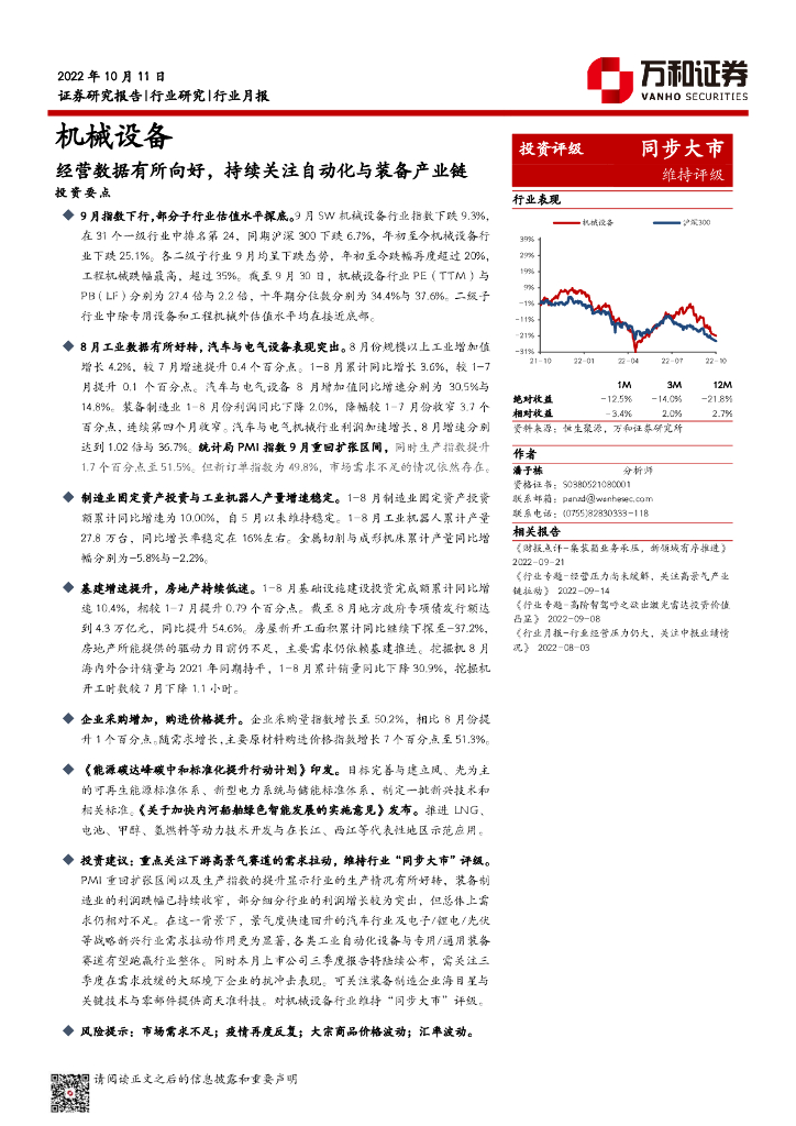 万和证券:机械设备行业月报:经营数据有所向好,持续关注自动化与装备产业链.pdf