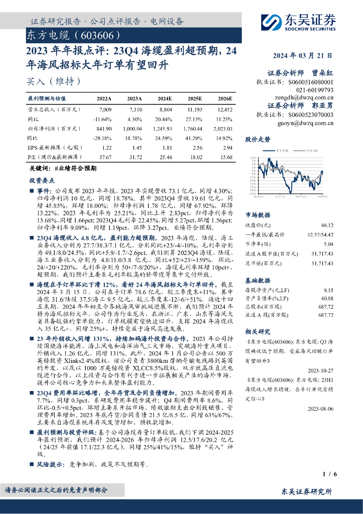 东吴证券:东方电缆(603606)-2023年年报点评:23Q4海缆盈利超预期,24年海风招标大年订单有望回升.pdf