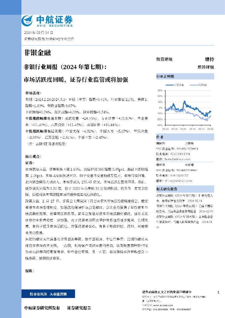 中航证券:非银行业周报(2024年第七期):市场活跃度回暖,证券行业监管或将加强.pdf