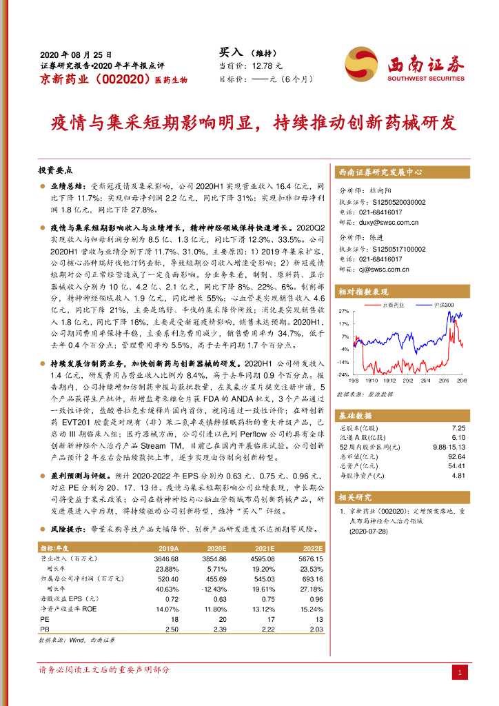 西南证券:京新药业(002020)-2020年半年报点评:疫情与集采短期影响明显,持续推动创新药械研发.pdf