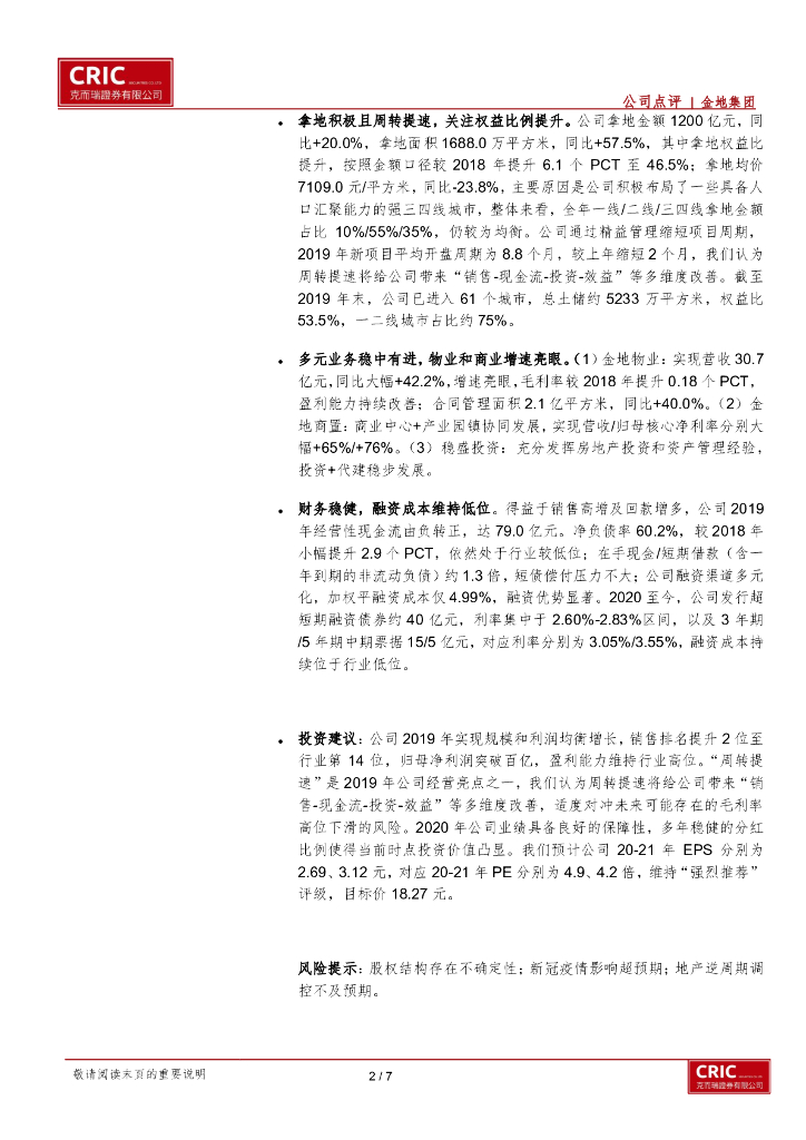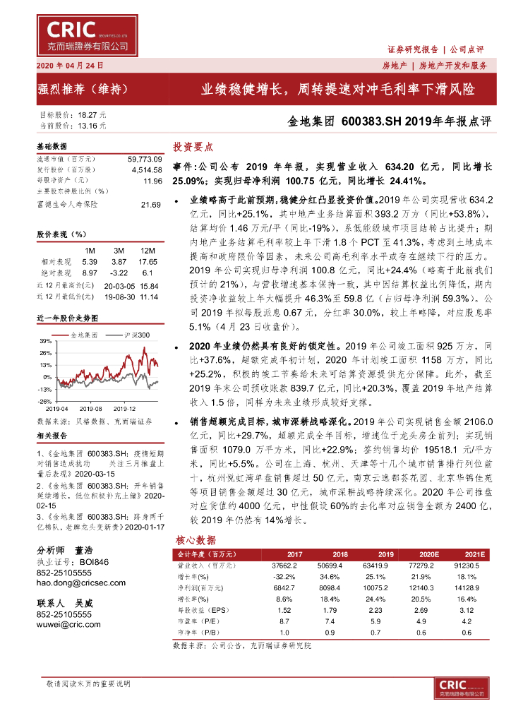 克而瑞证券:金地集团(600383)-2019年年报点评:业绩稳健增长,周转提速对冲毛利率下滑风险.pdf