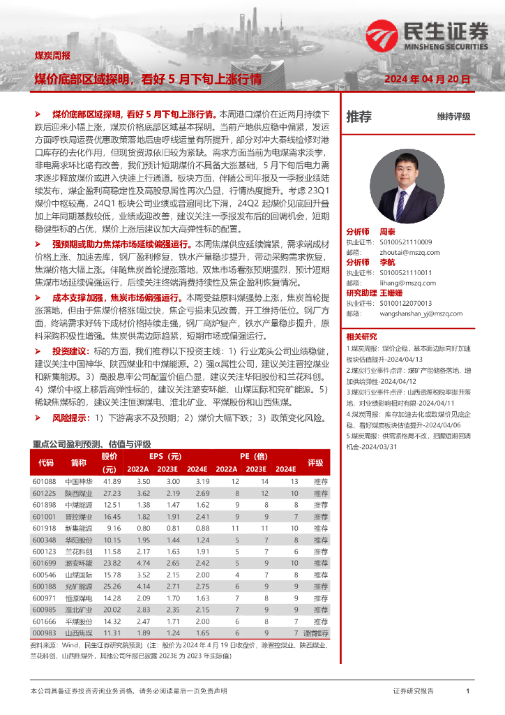 民生证券:煤炭周报:煤价底部区域探明,看好5月下旬上涨行情.pdf