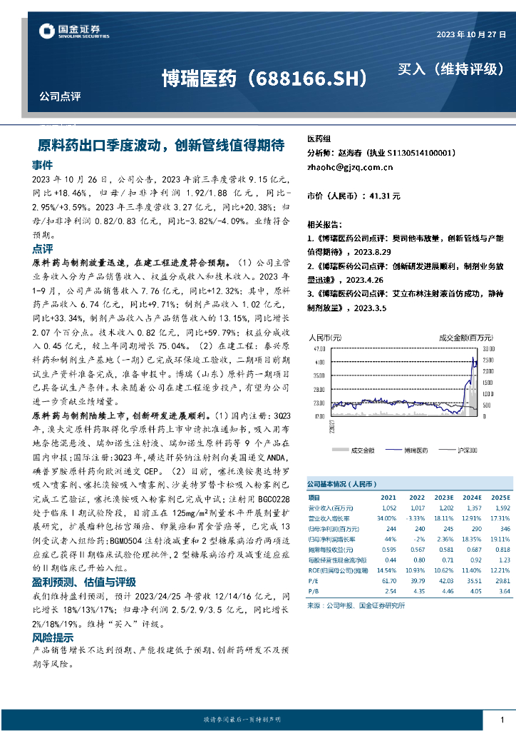 国金证券:博瑞医药(688166)-原料药出口季度波动,创新管线值得期待.pdf