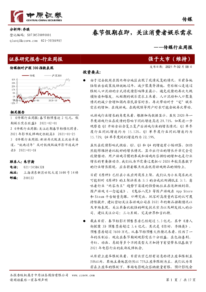 中原证券:传媒行业周报:春节假期在即,关注消费者娱乐需求.pdf