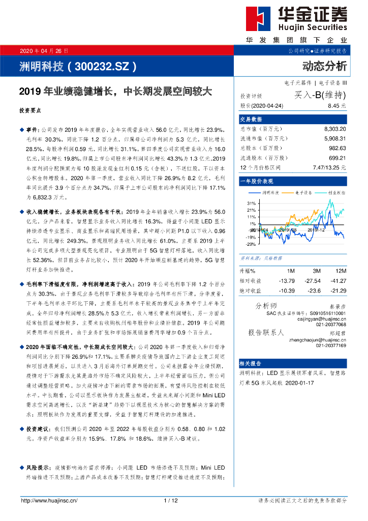华金证券:洲明科技(300232)-2019年业绩稳健增长,中长期发展空间较大.pdf