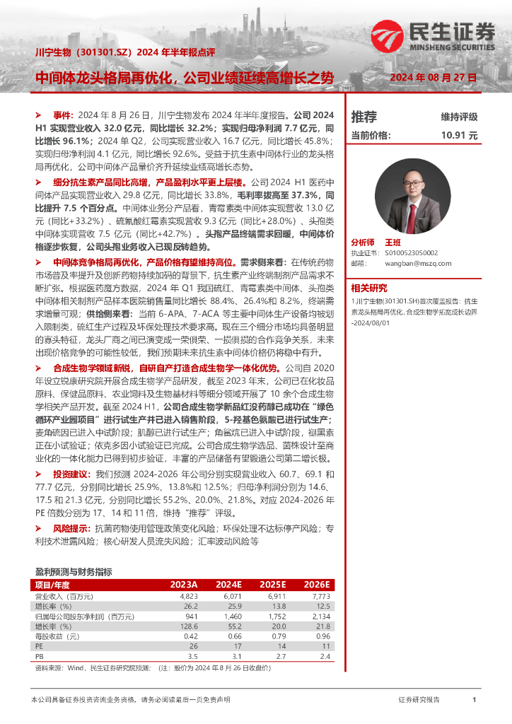 民生证券:川宁生物(301301)-2024年半年报点评:中间体龙头格局再优化,公司业绩延续高增长之势.pdf