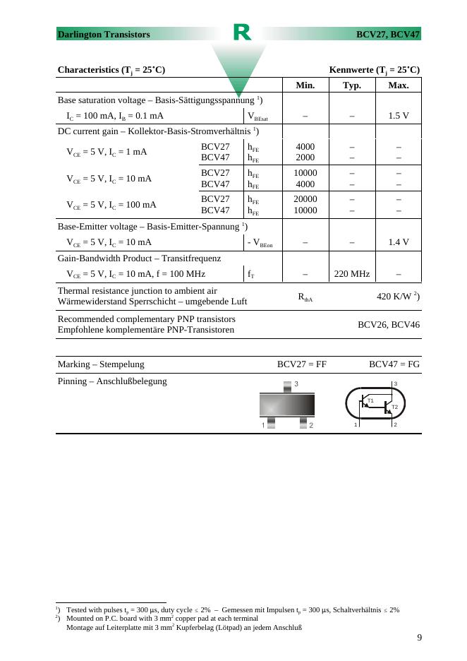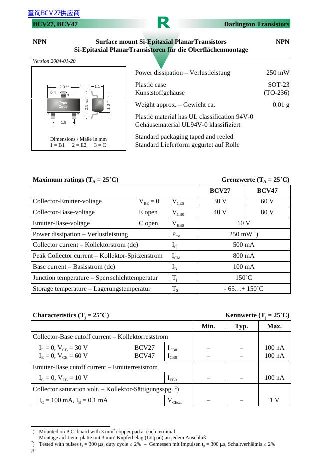 NPN BCV27, BCV47 Darlington Transistors 数据手册.pdf