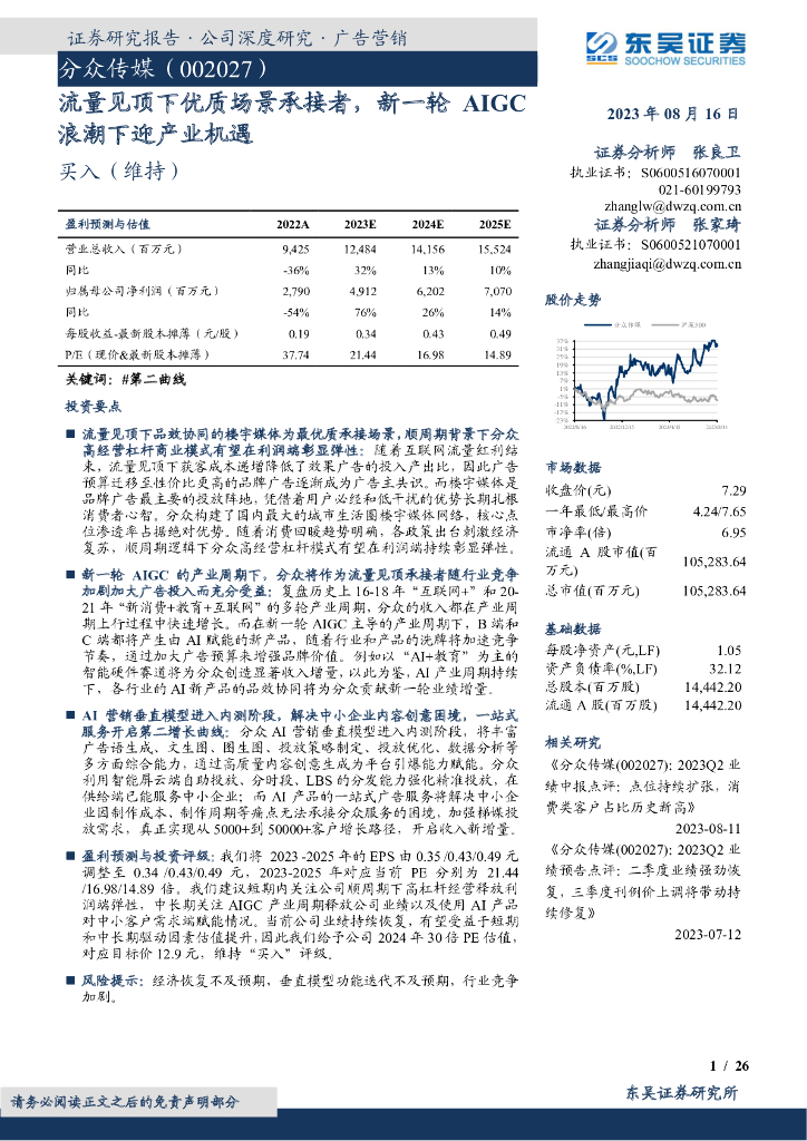 东吴证券:分众传媒(002027)-流量见顶下优质场景承接者,新一轮AIGC浪潮下迎产业机遇.pdf