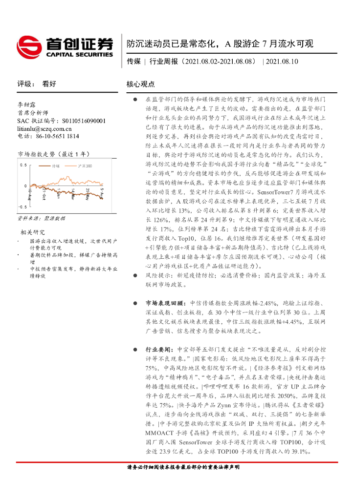 首创证券:传媒行业周报:防沉迷动员已是常态化,A股游企7月流水可观.pdf