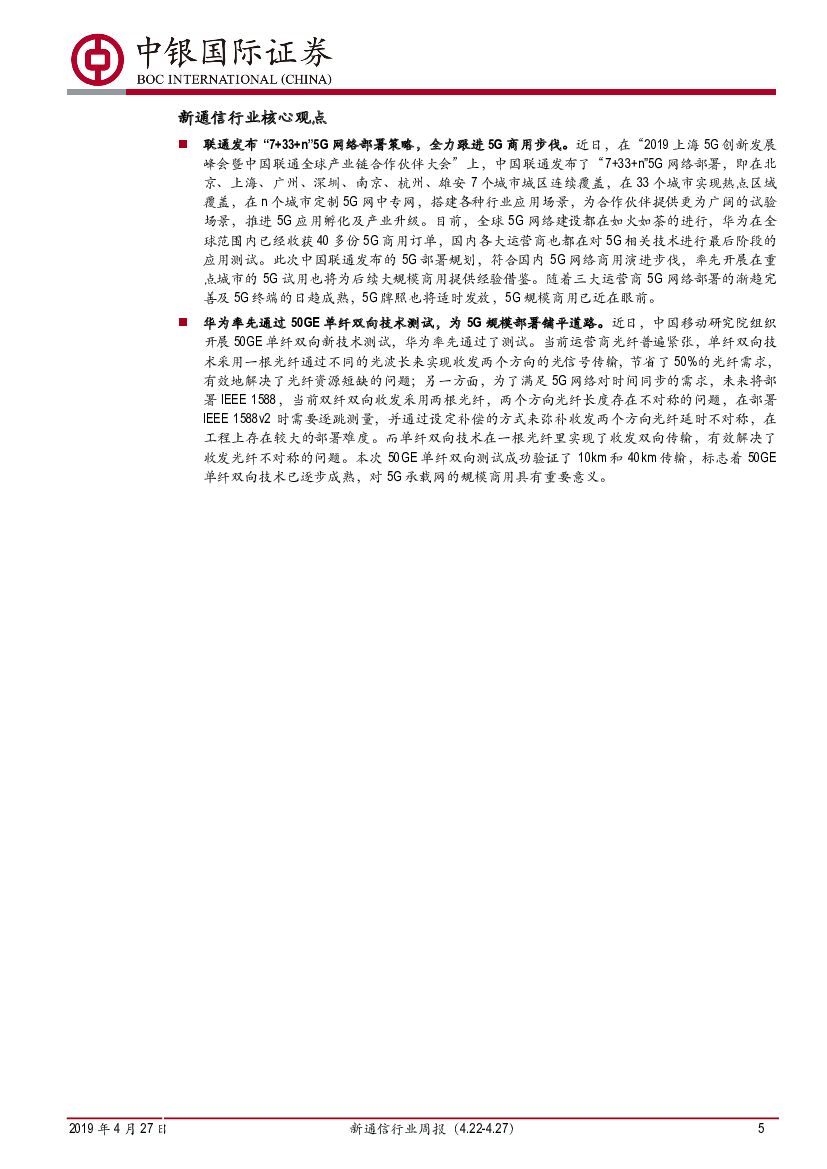 中银国际:新通信行业周报:联通发布“7+33+n”5G网络部署策略,华为率先通过50GE单纤双向技术测试.pdf