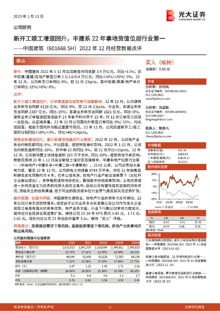 光大证券:中国建筑(601668)-2022年12月经营数据点评:新开工竣工增速回升,中建系22年拿地货值位居行业第一.pdf