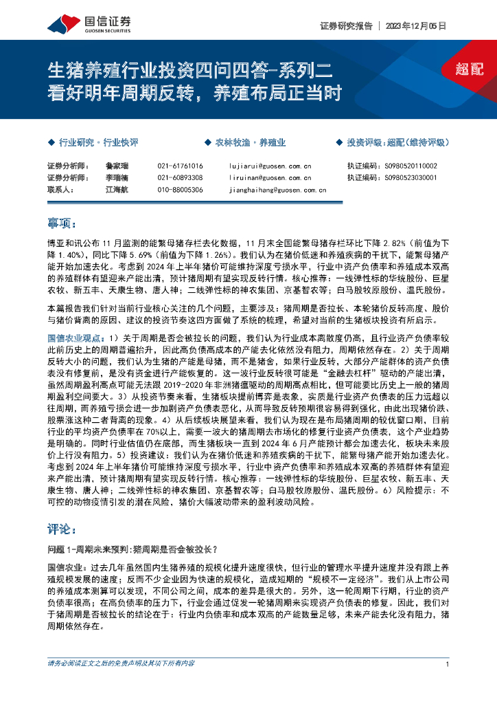 国信证券:生猪养殖行业投资四问四答-系列二:看好明年周期反转,养殖布局正当时.pdf