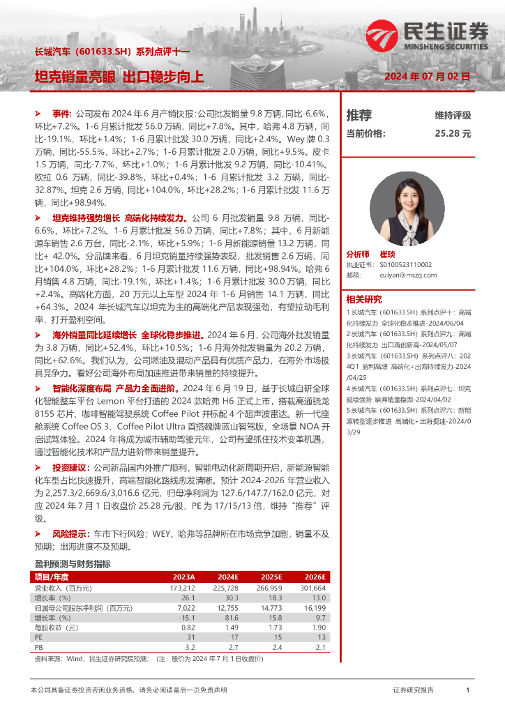 民生证券:长城汽车(601633)-系列点评十一:坦克销量亮眼出口稳步向上.pdf