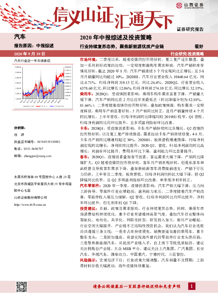 山西证券:汽车行业2020年中报综述及投资策略:行业持续复苏态势,聚焦新能源优质产业链.pdf