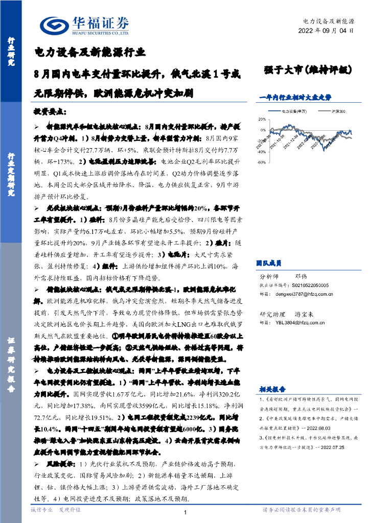华福证券:电力设备及新能源行业:8月国内电车交付量环比提升,俄气北溪1号或无限期停供,欧洲能源危机冲突加剧.pdf