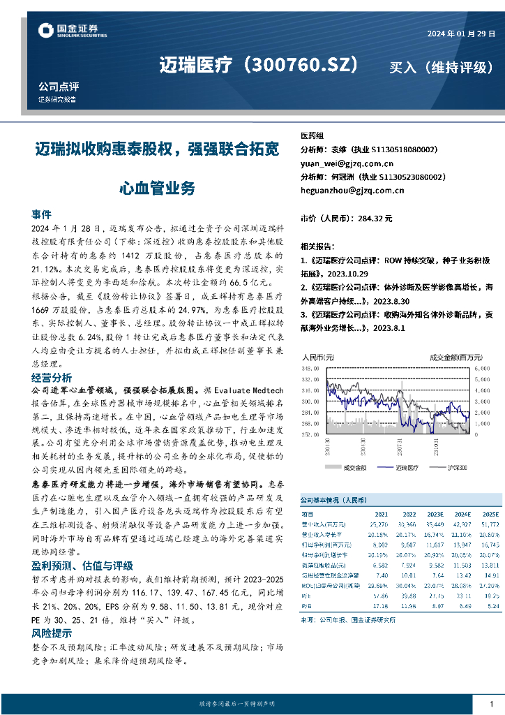 国金证券:迈瑞医疗(300760)-迈瑞拟收购惠泰股权,强强联合拓宽心血管业务.pdf