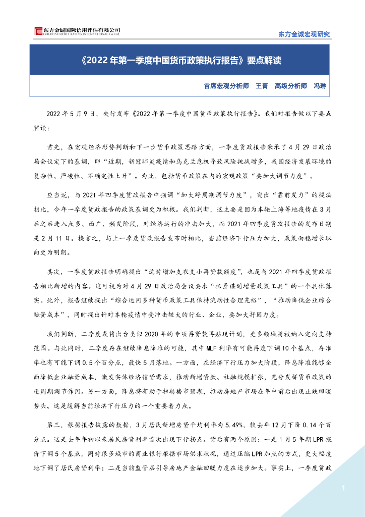 东方金诚:《2022年第一季度中国货币政策执行报告》要点解读.pdf