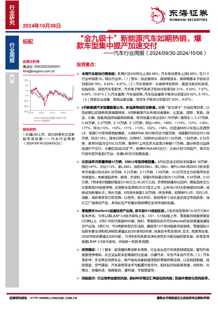 东海证券:汽车行业周报:“金九银十”新能源汽车如期热销,爆款车型集中提产加速交付.pdf