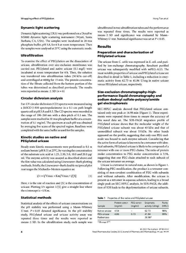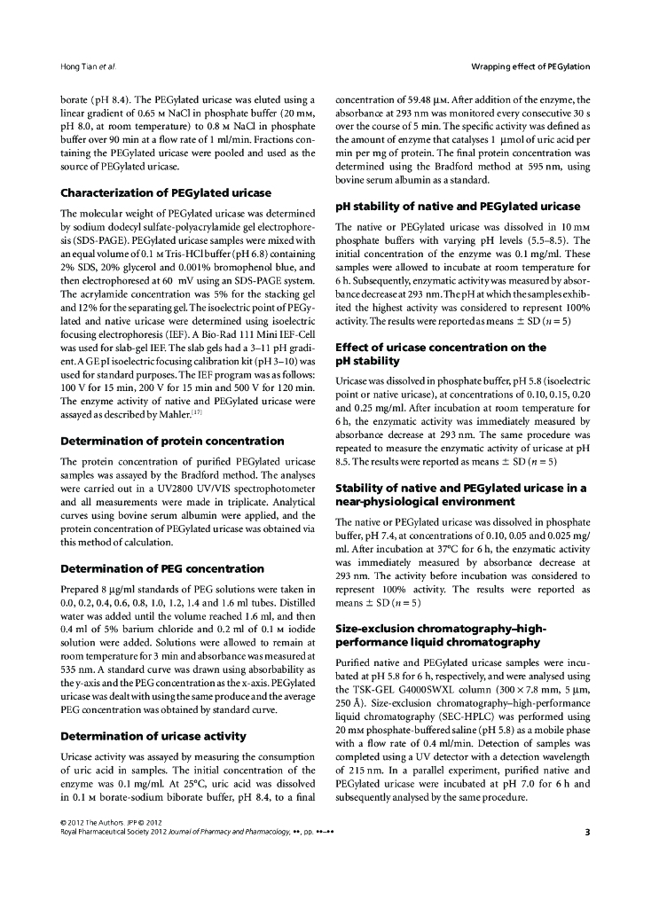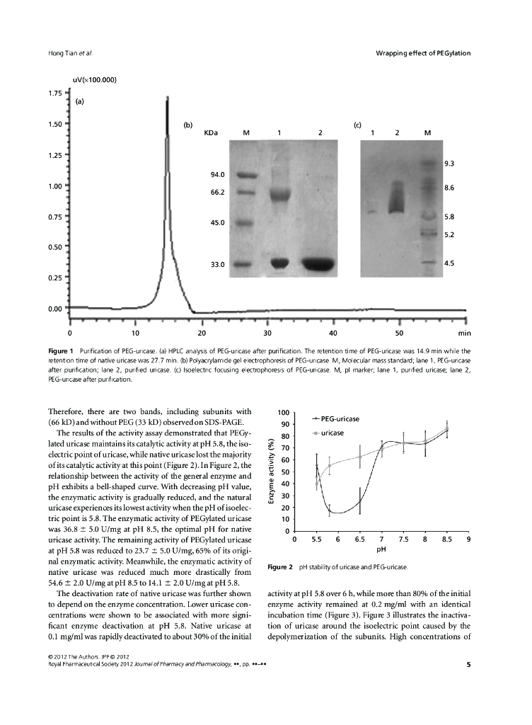 《药学的生物化学基础》文献资料-PEGylation enhancement of pH stability of uricase via.pdf