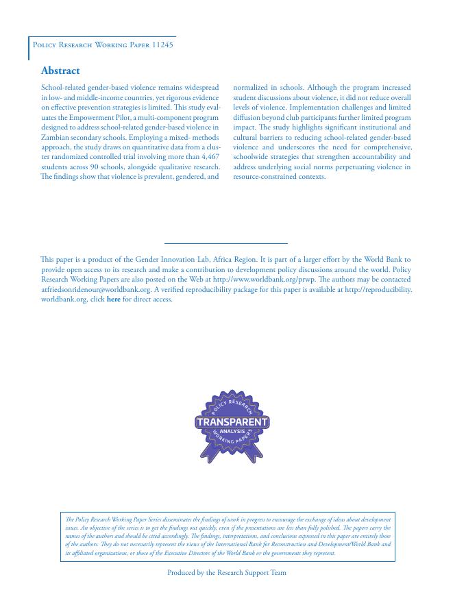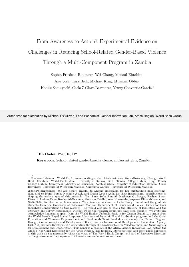 世界银行:从意识到行动?赞比亚通过多组成部分方案减少与学校有关的性别暴力挑战的实验证据(英文版)