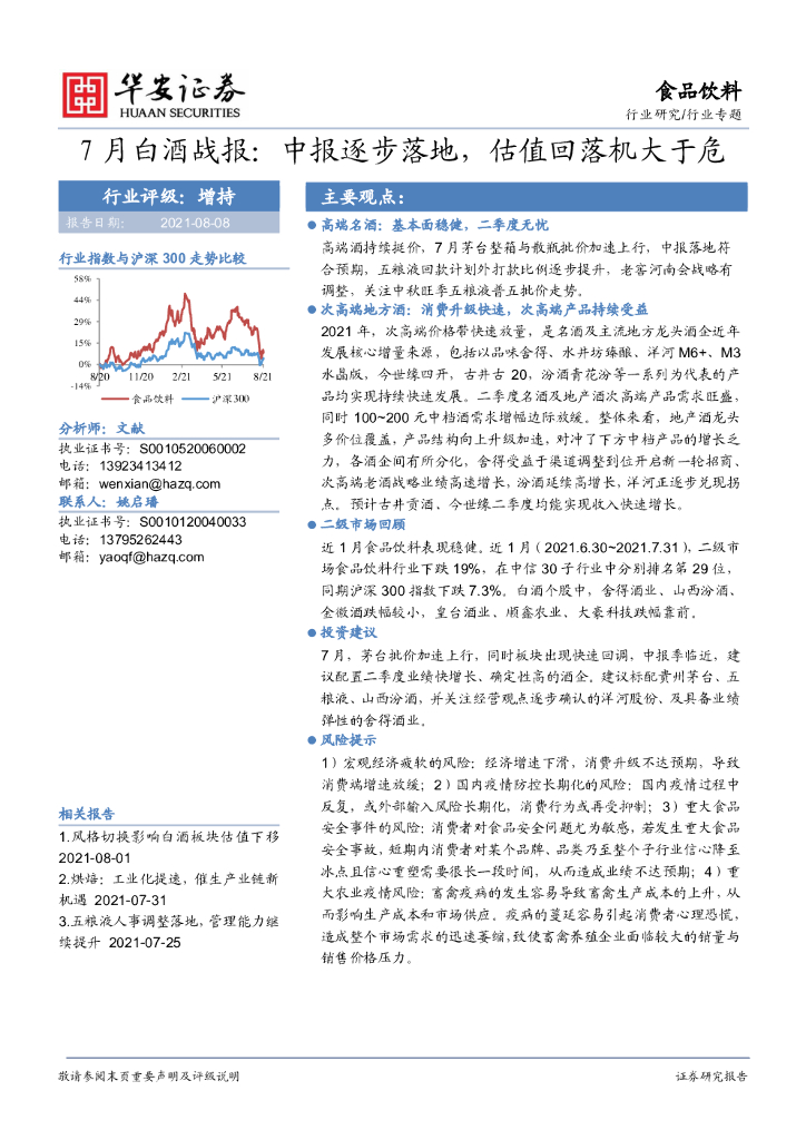 华安证券:食品饮料行业专题:7月白酒战报:中报逐步落地,估值回落机大于危.pdf