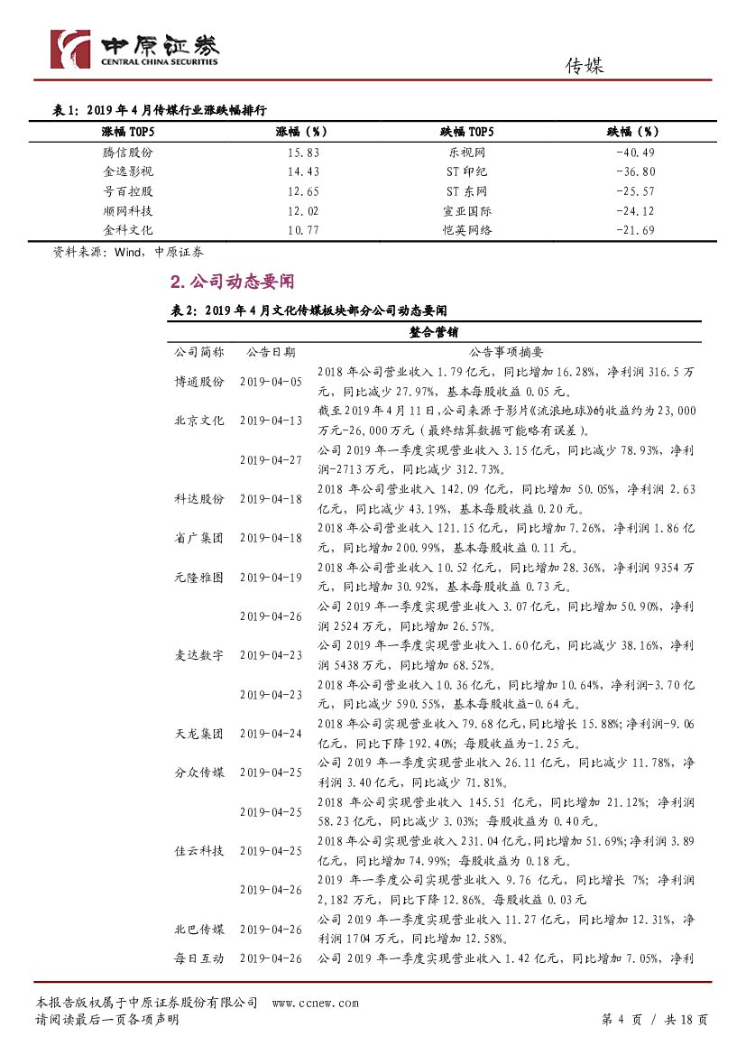 中原证券:文化传媒行业月报:年报与一季报发布完毕,关注19年游戏公司业绩回暖.pdf