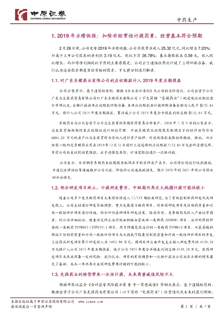 中原证券:众生药业(002317)-公司点评报告:一次性计提坏账准备,轻装前行.pdf