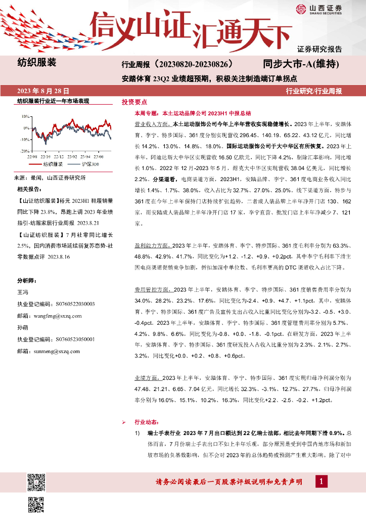 山西证券:纺织服装行业周报:安踏体育23Q2业绩超预期,积极关注制造端订单拐点.pdf