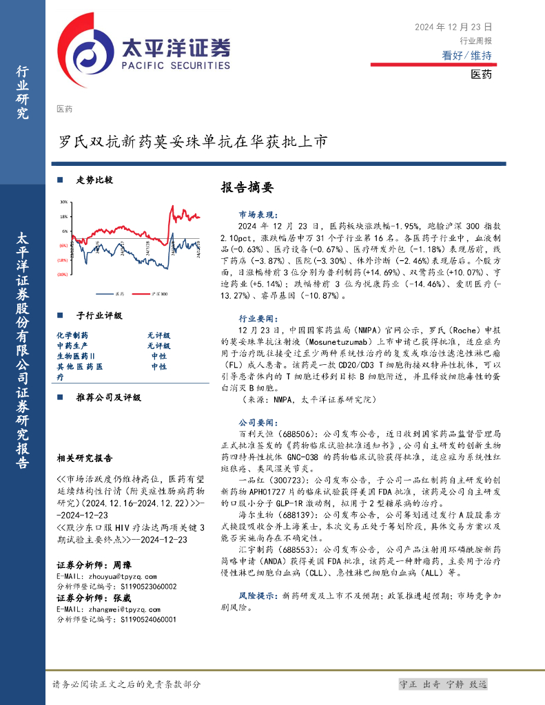 太平洋证券:医药行业周报:罗氏双抗新药莫妥珠单抗在华获批上市.pdf