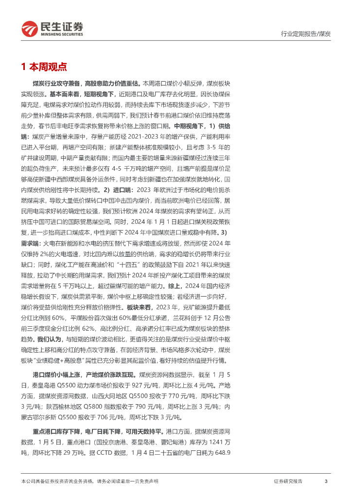 民生证券:煤炭周报:煤炭行业攻守兼备,高股息助力价值重估.pdf