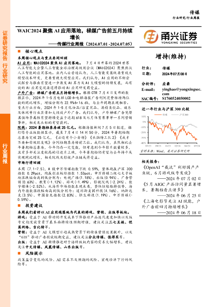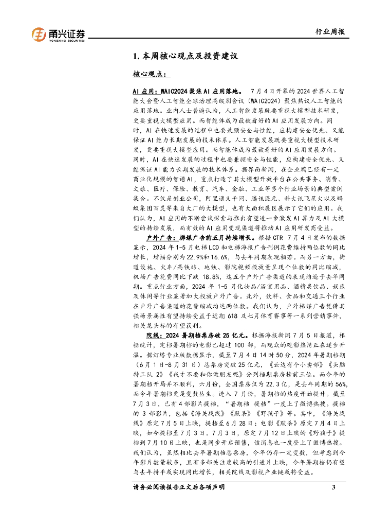 甬兴证券:传媒行业周报:WAIC2024聚焦AI应用落地,梯媒广告前五月持续增长.pdf