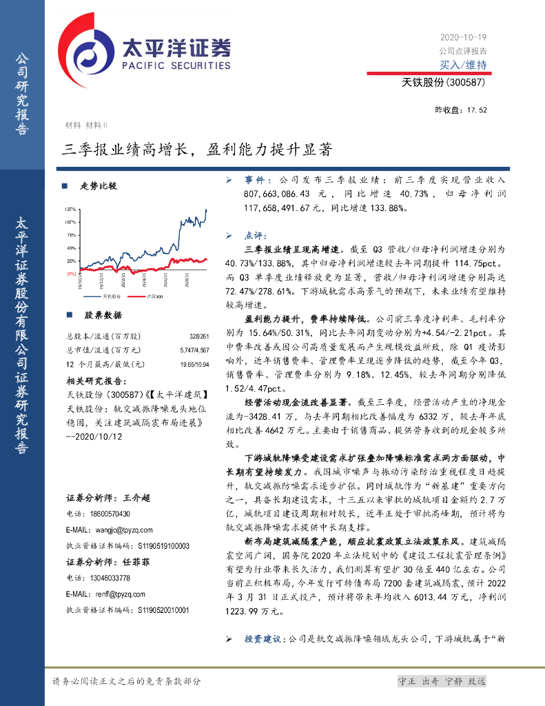 太平洋证券:天铁股份(300587)-三季报业绩高增长,盈利能力提升显著.pdf