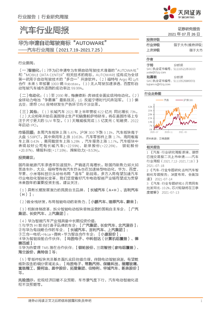 天风证券:汽车行业周报:华为申请自动驾驶商标“AUTOWARE”.pdf