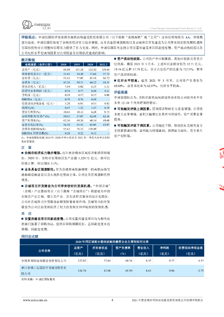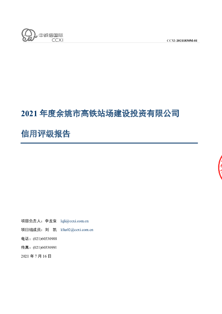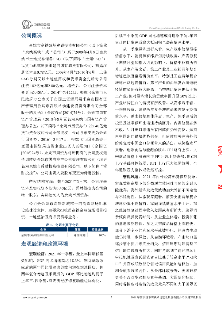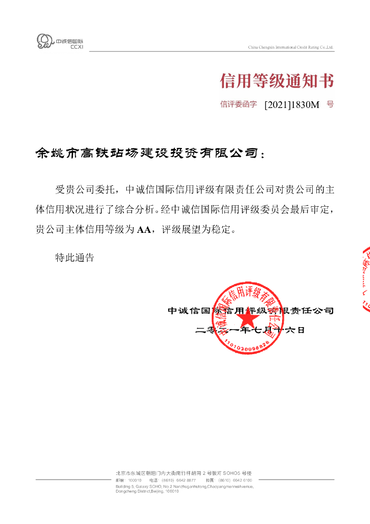 中诚信:余姚市高铁站场建设投资有限公司主体信用评级报告及跟踪评级安排.pdf
