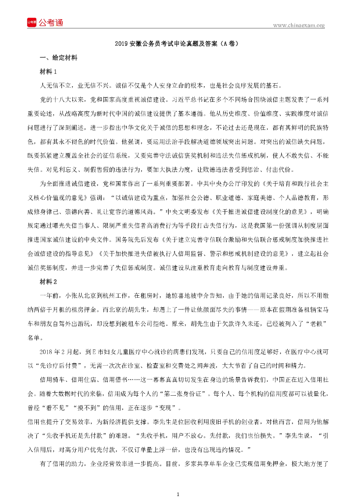 2019年安徽公务员考试申论真题及答案(A卷).pdf