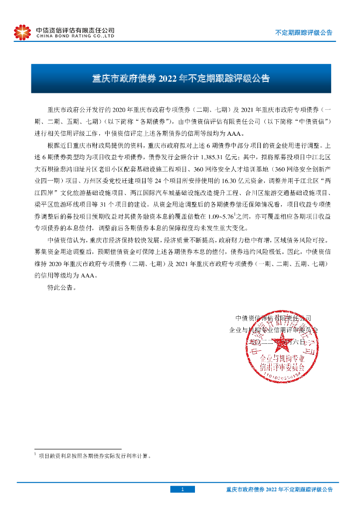 中债资信:重庆市政府债券2022年不定期跟踪评级公告.pdf