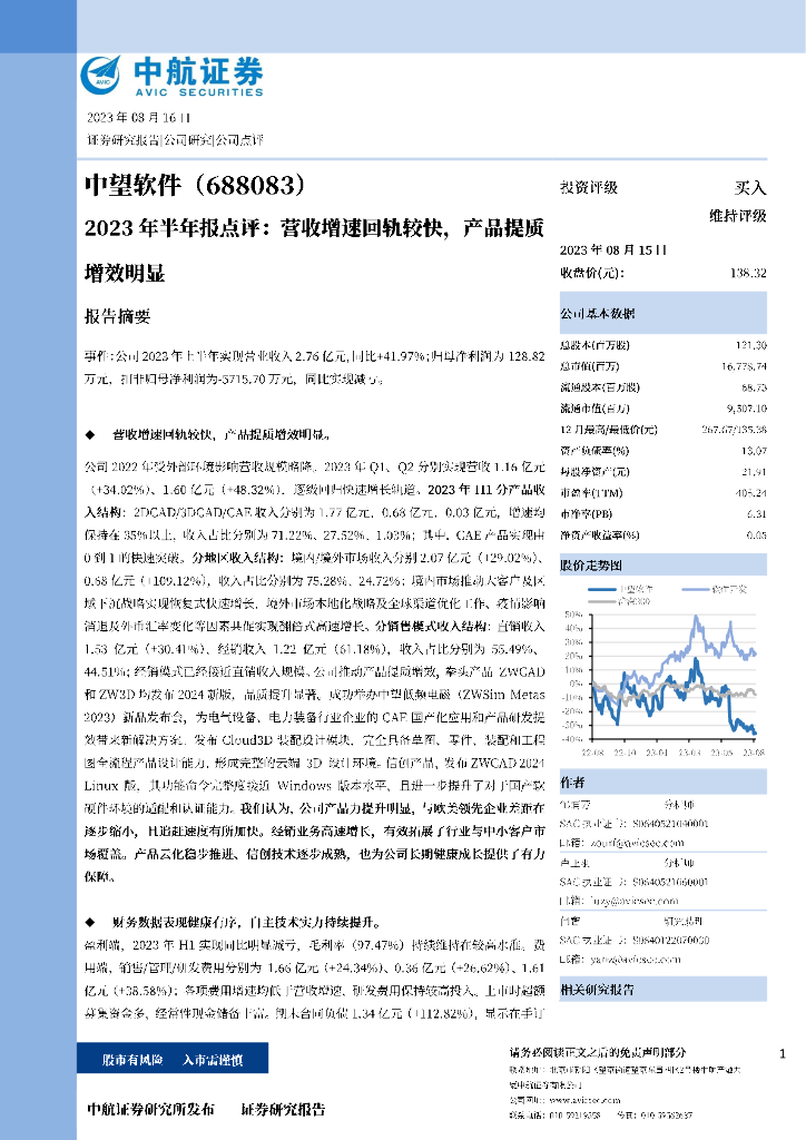 中航证券:中望软件(688083)-2023年半年报点评:营收增速回轨较快,产品提质增效明显.pdf