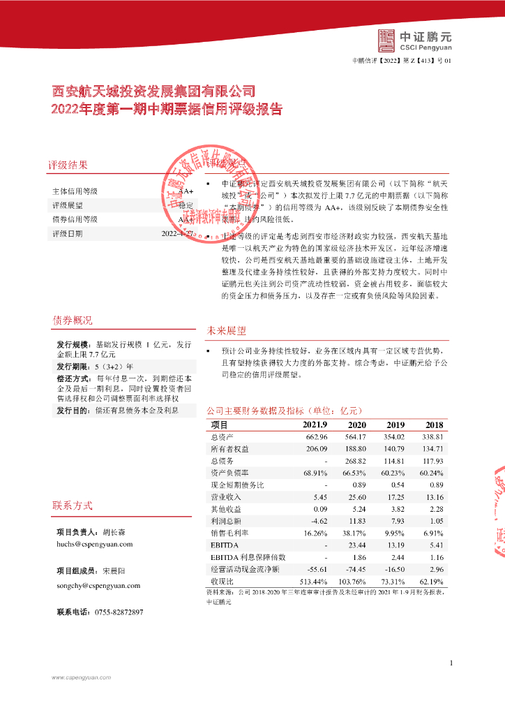 鹏元:西安航天城投资发展集团有限公司2022年度第一期中期票据债项信用评级报告及跟踪评级安排.pdf