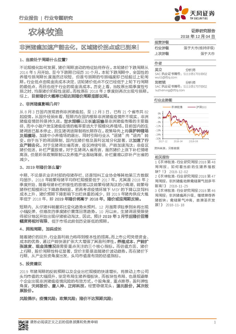 天风证券:农林牧渔行业专题研究:非洲猪瘟加速产能去化,区域猪价拐点或已到来!.pdf