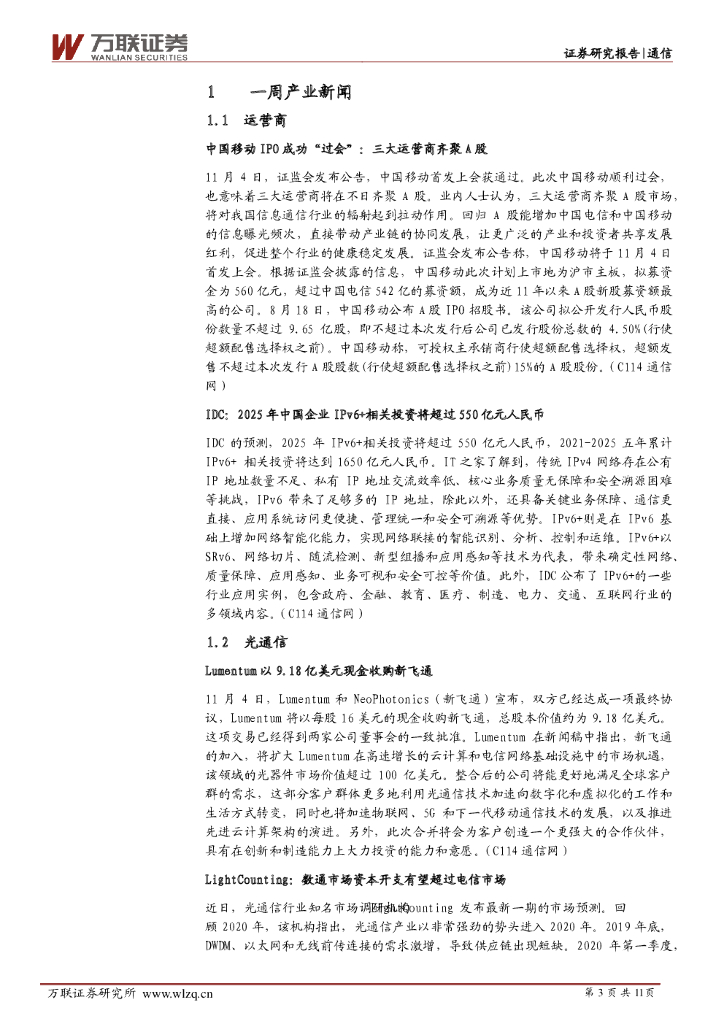万联证券:通信行业周观点:中国移动成功过会,关注主设备、运营商、物联网等赛道.pdf
