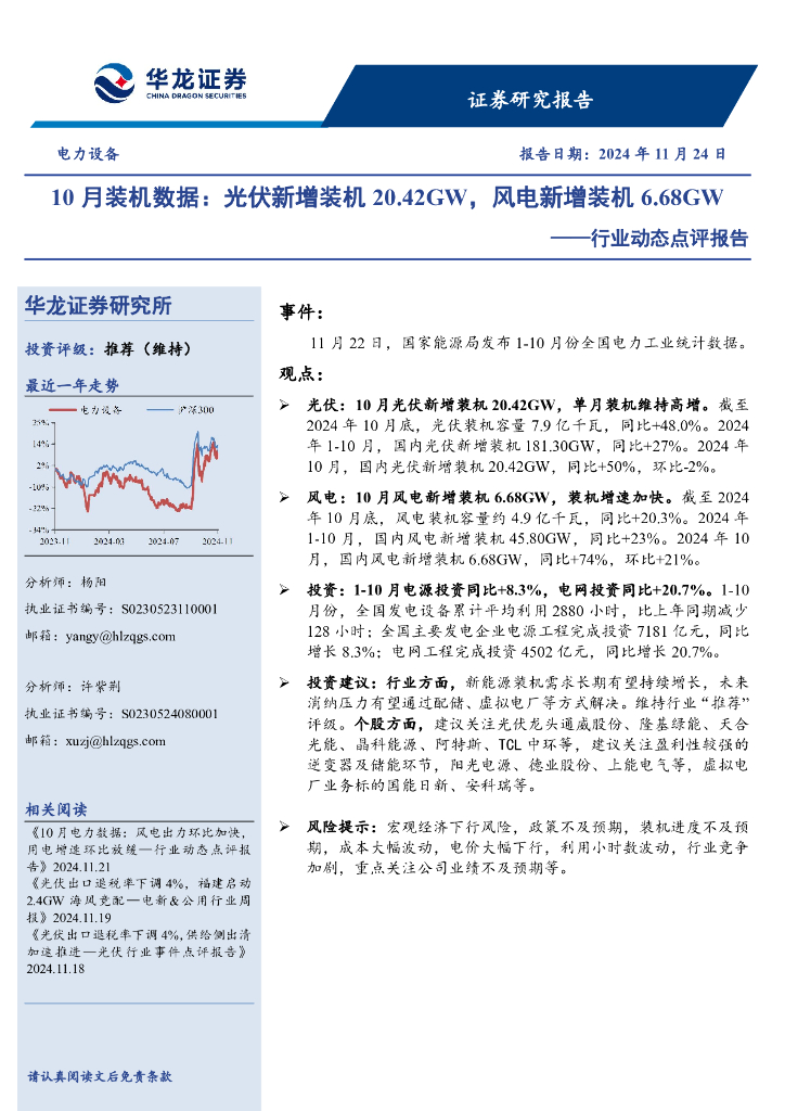 华龙证券:电力设备行业动态点评报告:10月装机数据,光伏新增装机20.42GW,风电新增装机6.68GW.pdf