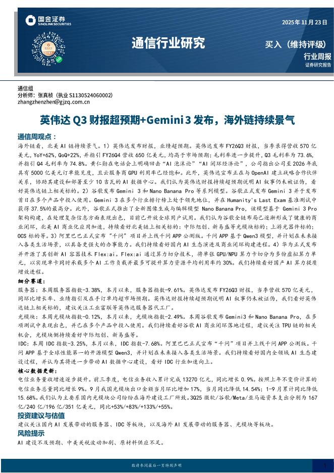 国金证券:通信行业周报:英伟达Q3财报超预期+Gemini3发布,海外链持续景气.pdf