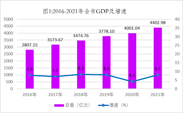 根据地区生产总值统一核算结果,全年地区生产总值4402.98亿元,比上年增长8.1%。其中:第一产业增加值462.49亿元,增长9.2%;第二产业增加值1834.02亿元,增长7.5%;第三产业增加值2106.46亿元,增长8.3%。按常住人口计算,人均地区生产总值87268元,增长8.7%。