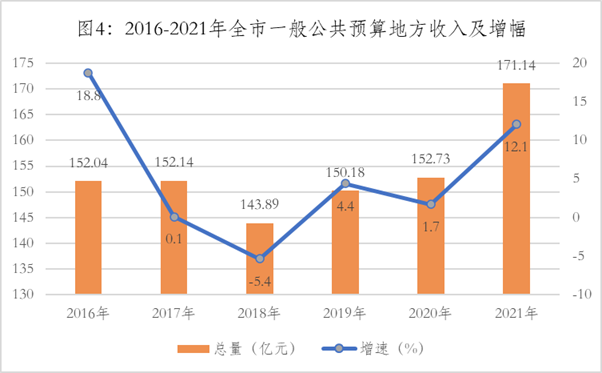 全年全市一般公共预算收入363.77亿元,比上年增长9.1%,其中:税收收入299.27亿元,增长8.9%;非税收入64.50亿元,增长10.0%。一般公共预算地方收入171.14亿元,比上年增长12.1%,其中:税收收入108.14亿元,增长13.2%。税收收入中,增值税40.05亿元,增长14.6%;企业所得税8.80亿元,增长7.3%。一般公共预算支出551.61亿元,增长1.5%。