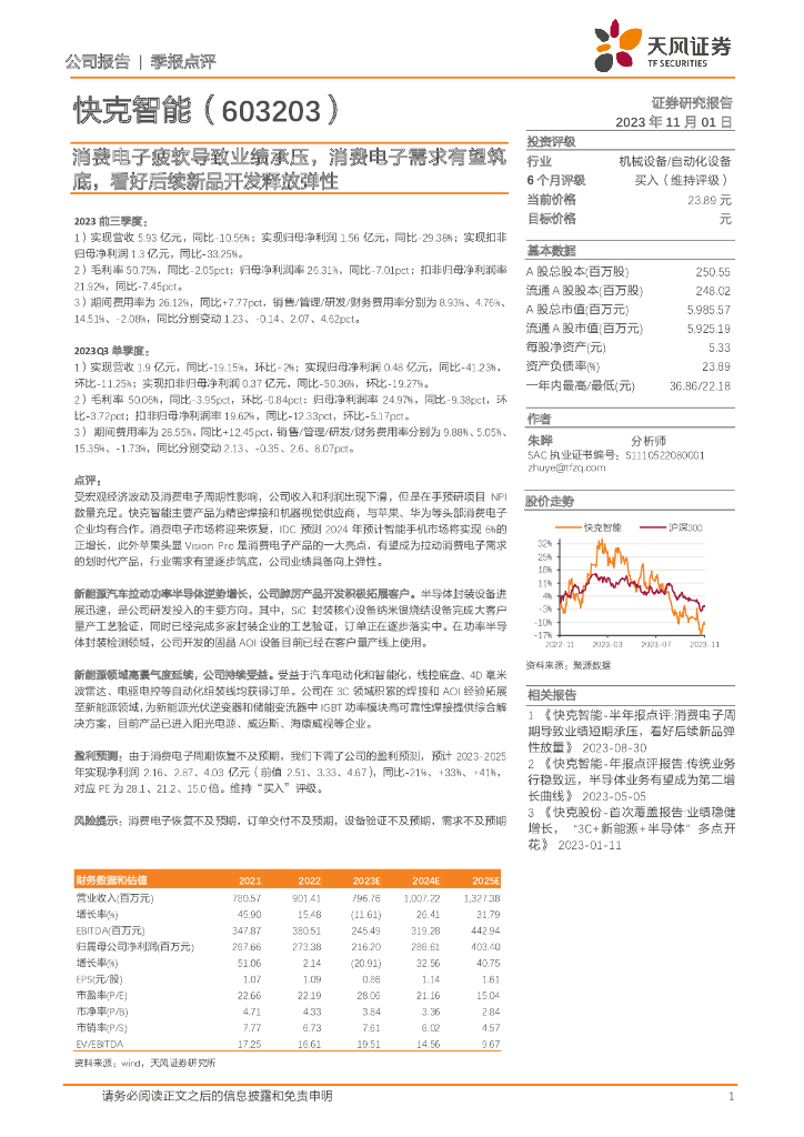 天风证券:快克智能(603203)-消费电子疲软导致业绩承压,消费电子需求有望筑底,看好后续新品开发释放弹性.pdf